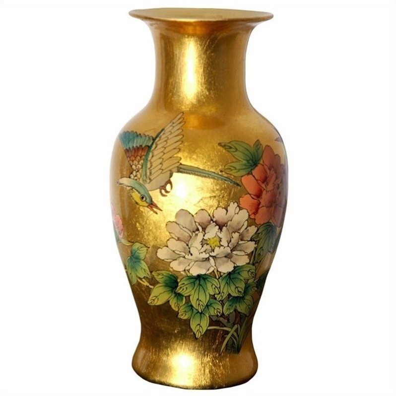![]() Oriental Furniture - Vases / Urns - PORFTVGB - This delicately crafted porcelain vase demonstrates a simple elegance in form, and features a hand-painted birds and flowers motif. Handcrafted by a family of artisans in the Guangdong province of mainland China for over three generations. Made of actual squares of gold leaf applied onto porcelain. Hand-finished with seven coats of rich, clear lacquer. An excellent value for this level of craftsmanship.Finish: goldMade of porcelainTraditional styleAuthentic 24 carat gold leaf appliqueHand painted ming birds and flowers art7 coat lacquer finishHand-craftedSpecifications:Product Weight: 7lbsOverall Dimensions: 12.25"" H x 8"" W x 8"" D Price: 69.00 |