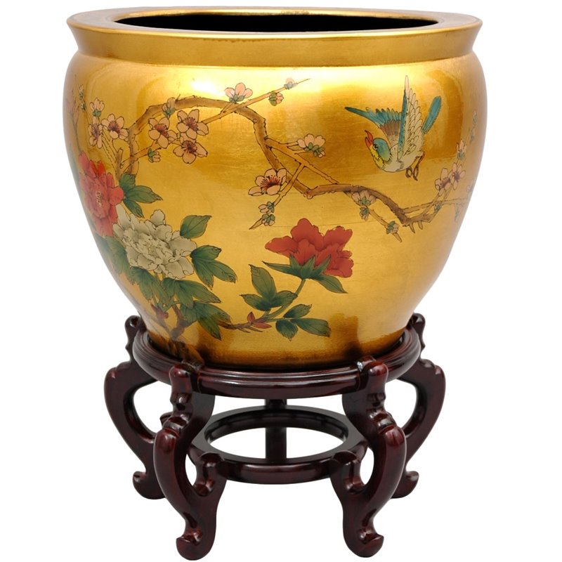 ![]() Oriental Furniture - Vases / Urns - POR14FBGPB - This elegant, eye catching Oriental fishbowl is handmade from porcelain, gilded with a truly exquisite 24 carat gold leaf, and finished with a fine quality high luster hard clear lacquer. Each vase is singular work of art, having been hand painted with a delicately rendered birds and flower art motif. Finish: Gold Birds and FlowersMaterial: PorcelainBeautiful imported Oriental fishbowlAuthentic 24 carat gold leaf applique with high luster lacquerExquisite hand painted Ming birds and flowers artPlace planter pot inside bowl (No hole in bottom)Specifications:Overall Product Dimensions: 10.75"" H x 14"" W x 14"" DProduct Weight: 14 lbs Price: 299.00 |