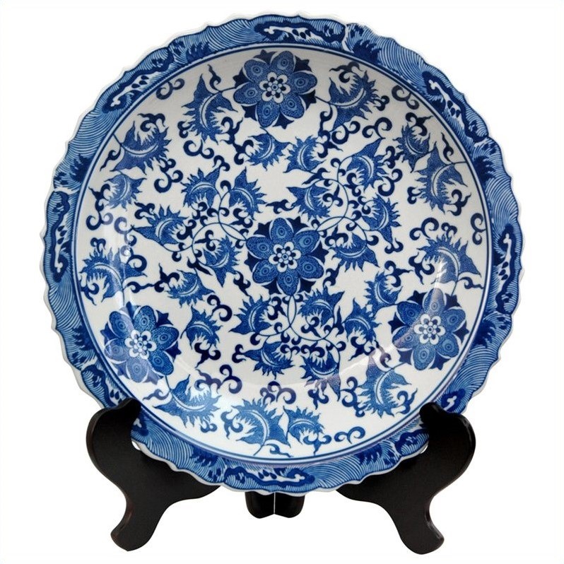 ![]() Oriental Furniture - Plates / Chargers - BWPLATEBWFL - NOTE: Photographed with the stand for display purposes only; stands are sold separately. If you choose to purchase the stand, select our 14"" size Rosewood Plate Stand as shown. Chinese export style decorative plate with classic vine and flower pattern and an antiqued ice crackle glaze. Display on a breakfront or a buffet, singly or in pairs, or mount on the wall in the dining room or kitchen. Ming blue and white porcelain compliments traditional American interiors as well as modern, eclectic decor. Large 14-inch diameter decorative plate. Fine Ming Chinese export porcelain floral design. One of many porcelain decor items we carry in the blue and white floral pattern.Finish: blue and whiteMade of fine ming Chinese export porcelainAntiqued ice crackle glazeDisplay on breakfront, buffet, shelf unit or mounted on the wallSpecifications:Overall Dimensions: 2"" H x 14"" W x 14"" DProduct Weight: 5.5lbs Price: 59.00 |