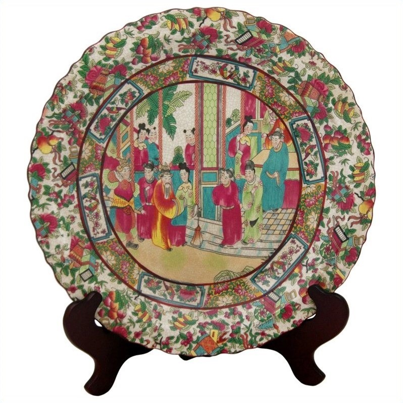 ![]() Oriental Furniture - Plates / Chargers - BWPLATERMD - NOTE: Photographed with the stand for display purposes only; stands are sold separately. If you choose to purchase the stand, select our 14"" size Rosewood Plate Stand as shown. Large decorative porcelain plate featuring a Asian courtyard scene image and center band with traditional Rose Medallion style panel art of lotuses and birds, fired onto the porcelain in a kiln. Bright floral and Asian object pattern on outer scalloped rim. High grade, durable Chinese porcelain ceramic, finished in a medium gloss crackle glaze.Finish: multicolorMade of high temperature fired Chinese porcelain ceramicDecorative scalloped edgeAccentuated courtyard sceneMedium gloss crackle glazeOriental themed pattern artSpecifications:Overall Dimensions: 2"" H x 14"" W x 14"" DProduct Weight: 5.5lbs Price: 69.00 |