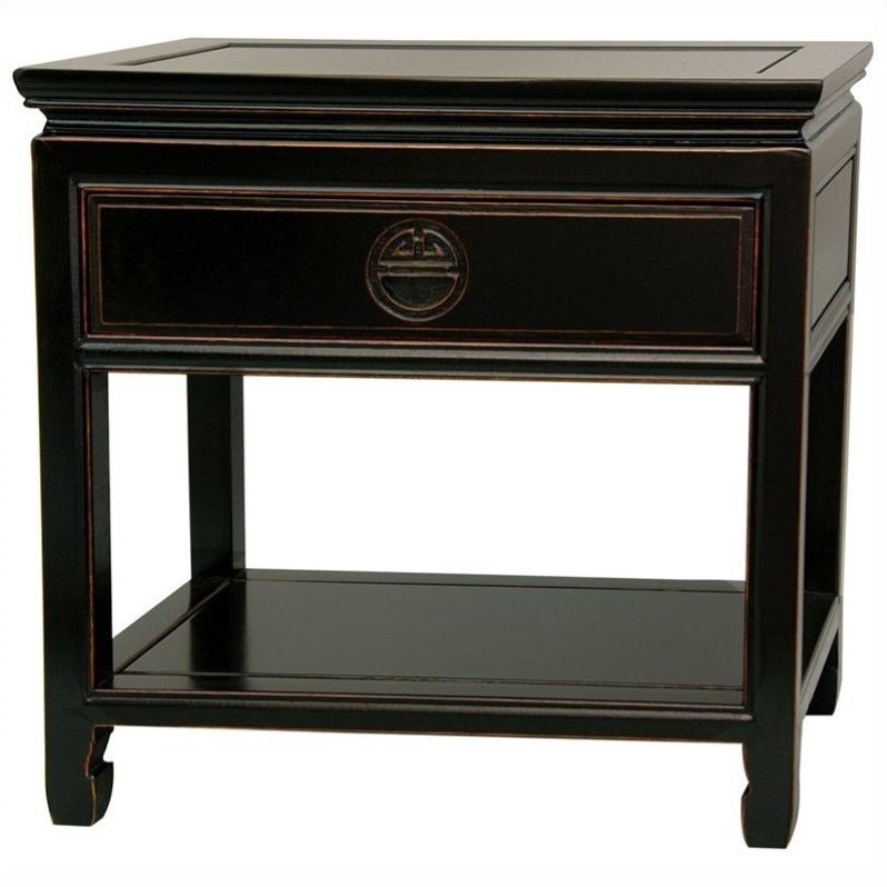 ![]() Oriental Furniture - Nightstands - STPA101AB - An elegantly finished, distressed black lacquer nightstand or end table, hand crafted from fine quality kiln dried Rosewood. A beautiful and practical design, with an easily accessed top drawer and open bottom shelf area, great for storing bedside reading. Authentic, sturdy and durable East Asian joinery and cabinetry. Convenient top drawer and large open bottom shelf. Carved ""Shou"" character long life medallion drawer handle. Offered in beautiful distressed black lacquer (shown) a two-tone stain finish. From one of the web's largest selections of fine oriental Rosewood furnishings. Designed with the classic Ming edged floating panel table top, to tolerate expansion from changes in moisture content in the wood. The drawer pull is carved in the shape of a ""Shou"", symbolizing long life. We also offer this cabinet in a beautiful two tone light medium Cherry stained finish, as well as a similar nightstand with cabinet doors instead of the open shelf. From one of the web's largest selections of oriental Asian design nightstands and end tables, in a wide variety of finishes, configurations, and dimensions.Finish: blackIncludes top drawer and large open bottom shelfMade of kiln dried rosewoodAuthentic, sturdy and durable east Asian joinery and cabinetryMing edged floating panel design of table topCarved ""shou"" character drawer handleSpecifications:Product Weight: 28.5lbsOverall Dimensions: 22"" H x 22"" W x 14"" D Price: 449.00 |