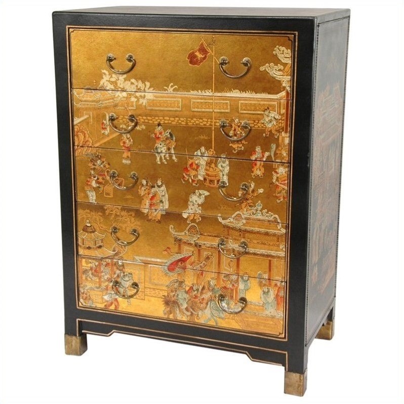 ![]() Oriental Furniture - Accent Chests - LQCAB4GLD - Hand crafted Ming design chest of drawers, built using durable Asian joinery and cabinetry. Drawer faces are decorated with gold leaf appliquandeacute;, hand painted with traditional Ming era art motifs, then covered in a hard, clear lacquer. At a foot and a half deep, provides significant drawer space, as well as an exceptional oriental accent for any room.Finish: goldIncludes 5 drawersTraditional styleAsian craftsmanshipHand painted designSpecifications:Overall Dimensions: 42"" H x 30"" W x 18"" DDrawers Dimension: 5"" H x 24.5"" W x 15"" DProduct Weight: 99.5lbs Price: 939.00 |
