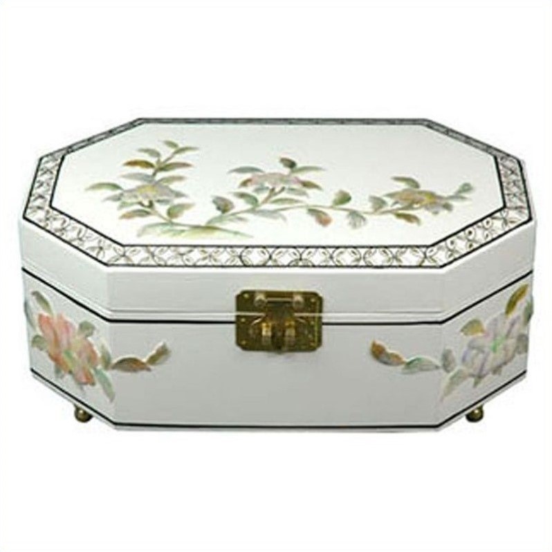 ![]() Oriental Furniture - Jewelry Boxes - LCQ325WM - Perfect for a unique gift, or as a special treat for yourself. Hand-crafted by artisans in the Guangdong province of mainland China and employs classic Chinese finishing techniques. Hand finished in a rich, clear lacquer. The compartment is lined with fine red felt, with a removable felt ring tray. Brass hardware is clear lacquered to resist tarnish. Available in white or black lacquer appliqued with exquisite hand carved mother-of-pearl design, or overlaid with striking 24-carat gold leaf, then hand-painted with a delicate Birds and Flowers design.Finish: whiteHand carved mother-of-pearl designRemovable felt ring trayCompartment is lined with fine red feltRich and clear lacquer finishHandcraftedSpecifications:Overall Dimensions: 4.5"" H x 12"" W x 8"" DOverall Weight: 4 lbs Price: 69.00 |